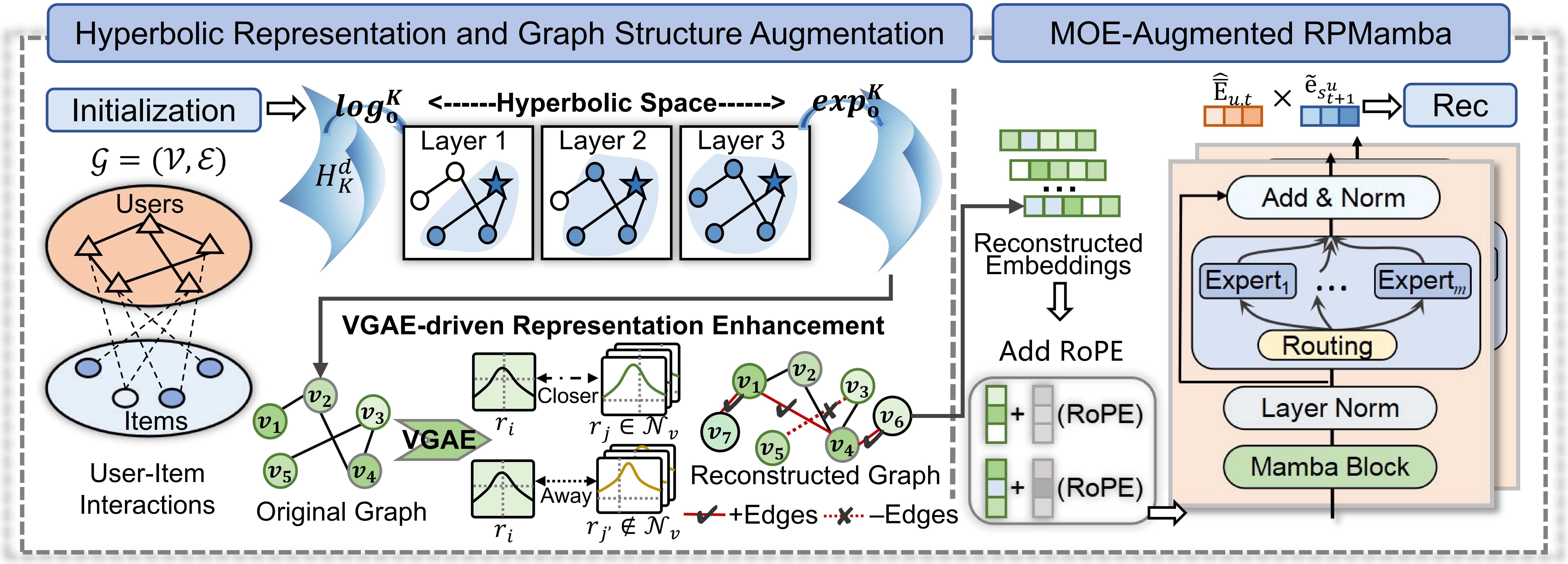 论文概述:序列推荐旨在根据用户的历史行为预测其下一次可能的交互,是推荐系统的重要分支。尽管近年来基于Transformer和Mamba的模型在长序列建模方面取得了显著进展,但仍存在两大关键瓶颈:其一,多数方法仅在欧几里得空间中进行特征学习,难以捕获用户与项目间潜在的层次结构与高阶关系;其二,Mamba结构中的静态前馈网络限制了模型对多样化用户偏好的动态适应能力。针对这些问题,本文提出了一种双曲增强混合专家Mamba框架(Hyperbolic-Enhanced Mixture-of-Experts Mamba, HM2Rec),在结构表示与序列建模两方面实现协同优化。具体而言,HM2Rec首先构建用户—项目交互图,并通过双曲图卷积网络(Hyperbolic GCN)在双曲空间中嵌入节点,有效保留层次化与全局结构特征。随后,采用变分图自编码器(VGAE)对节点嵌入进行分布式重构,从而增强图结构的鲁棒性与抗噪性。在此基础上,模型引入改进的Mamba序列编码器,并结合旋转位置编码以捕捉相对时序依赖;同时,以混合专家模块(Mixture-of-Experts, MOE)替代静态FFN,实现动态专家路由机制,使每个时间步的特征变换能够自适应地选择最合适的专家子网络,从而提升对动态用户兴趣的建模能力。实验表明,HM2Rec在推荐性能上显著优于18个主流基线模型。综上,HM2Rec通过融合几何结构建模与动态专家机制,在结构表达与序列建模层面均取得突破,为复杂用户行为场景下的个性化推荐提供了一种高效、鲁棒且具有理论创新性的解决方案。
