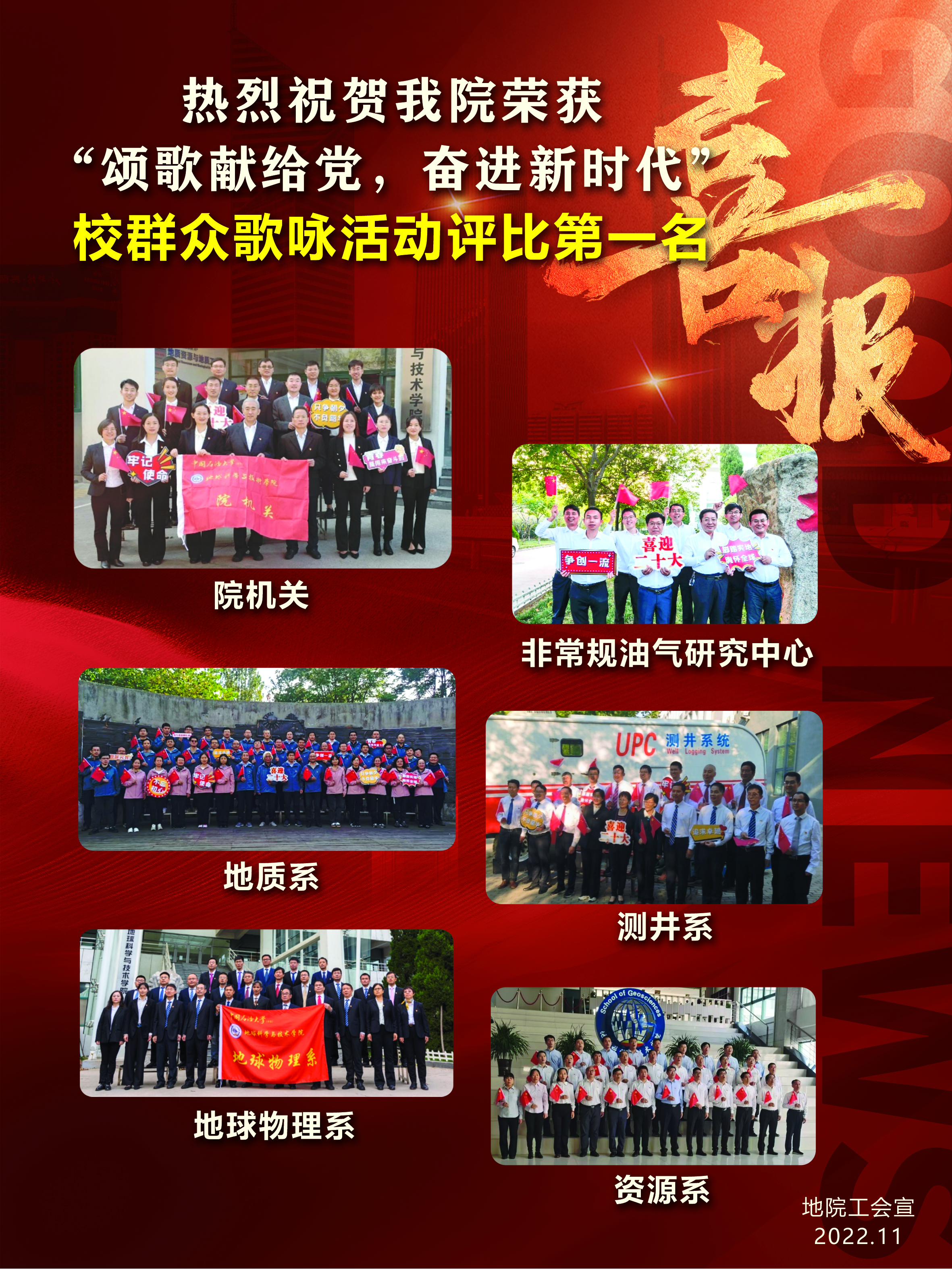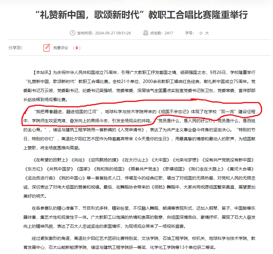 本次比赛的成功,很大一个原因是我们选了很好的歌曲——《祖国不会忘记》,学校主页报道很到位:“我把青春融进,融进祖国的江河”,地球科学与技术学院带来的《祖国不会忘记》体现了在学校“双一流”建设征程中,学院师生攻坚克难、奋发向上的昂扬斗志,引发全场观众的共鸣。”