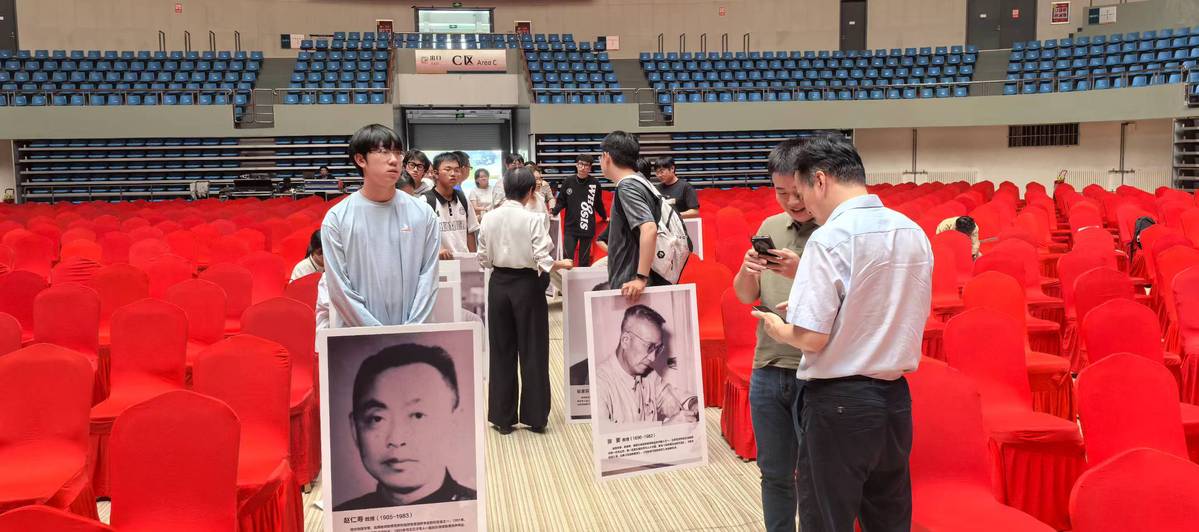 比赛演出照,学院教职工、学院国旗护卫班的学生、托举先辈照片背后的学院20名大学生们!