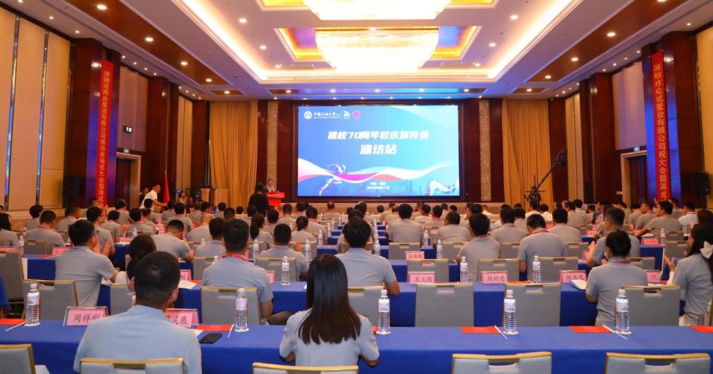 王勇为校友代表尹玉国授发校庆旗。邢建华宣布校庆旗传递潍坊站活动正式开始。校友们录制祝福视频、合影并传递校庆旗,向学校建校70周年献礼。