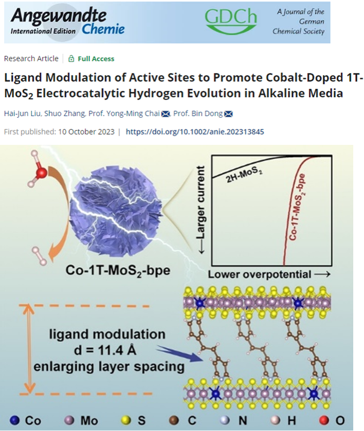 题为《配体调控策略促进Co掺杂1T-MoS2碱性析氢性能》(Ligand Modulation of Active Sites to Promote Cobalt-Doped 1T-MoS2Electrocatalytic Hydrogen Evolution in Alkaline Media)的成果发表在国际知名期刊Angewandte Chemie International Edition上,化学化工学院2020级博士研究生刘海君为第一作者,董斌教授、柴永明教授为通讯作者。