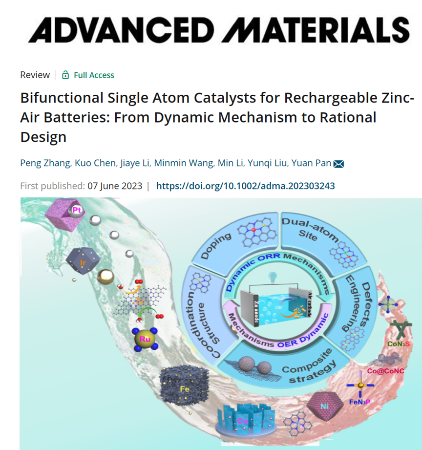 题为《用于锌空电池的双功能单原子催化剂:从动态机理到理性设计》(Bifunctional Single Atom Catalysts for Rechargeable Zinc-Air Batteries: From Dynamic Mechanism to Rational Design)的成果发表在国际材料领域顶级期刊Advanced Materials上,化学化工学院2020级博士研究生张鹏为第一作者,潘原副教授为通讯作者。