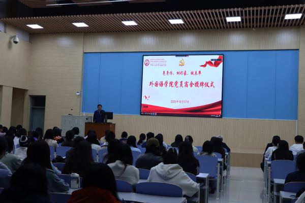 仪式首先由学生党员代表发言,2023级英语专业本科生王博文从以“严”立己、以“暖”聚力、以“行”示范等三个方面表达了做好党员宿舍表率的决心,体现了学生党员对初心使命的自觉践行。2023级英语笔译专业硕士研究生郭涵涵从支部建设和党员宿舍管理的实际出发,发出以“恒心”扎根学业服务、以“用心”聚焦日常需求、以“真心”投身志愿实践的倡议,展现了高年级党员以身作则、以党建促学风的责任担当。