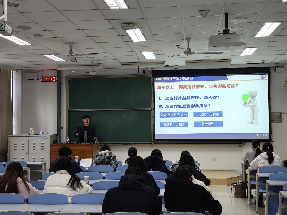 活动伊始,王晓龙用案例分析创业与创新创业的差异,从满足夜间用餐需求的烤肠摊、深耕通信领域的华为,到解决出行难题的小黄车,他指出“创业”侧重整合资源满足需求,而“创新创业”更需依托技术、产品或服务模式的开拓性创新。谈及科创实践与竞赛,他详细介绍赛事分类,重点解读中国国际“互联网+”大学生创新创业大赛和“挑战杯”的特点、参赛流程与评价标准。此外,王晓龙建议结合专业优势,从社会价值角度挖掘选题,鼓励团支部成员通过提升“智商、情商、逆商”积累实践经验。